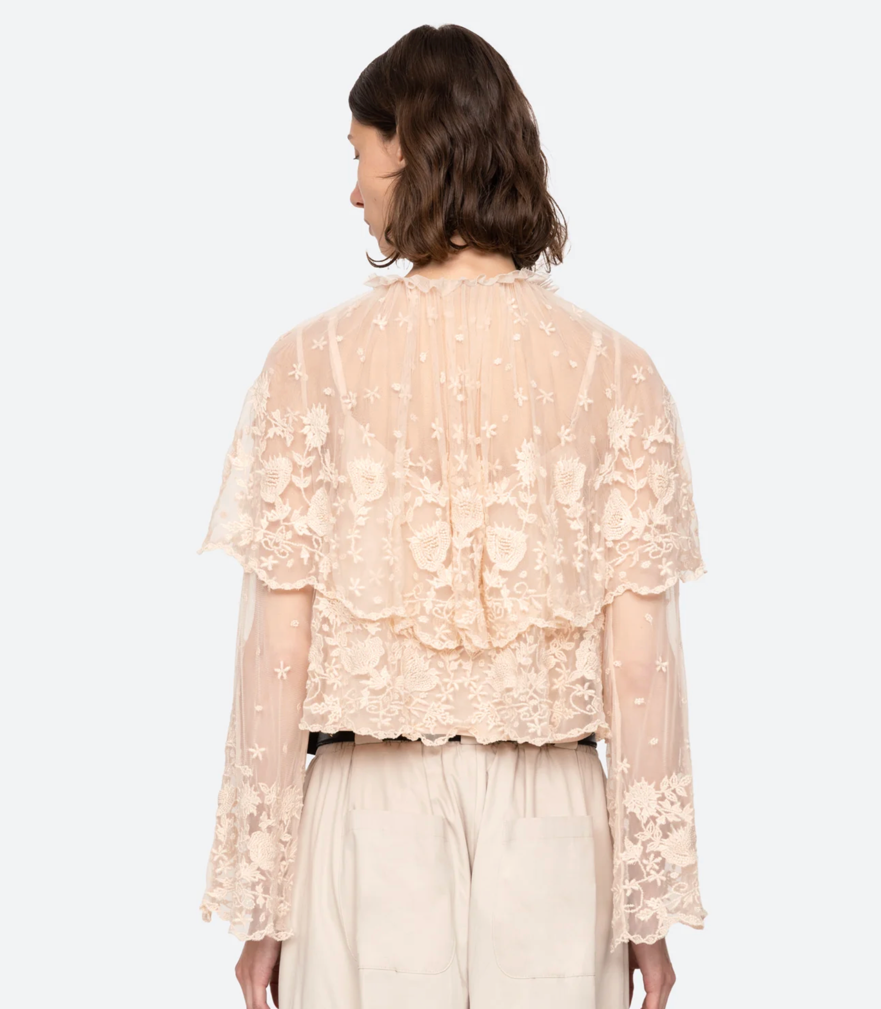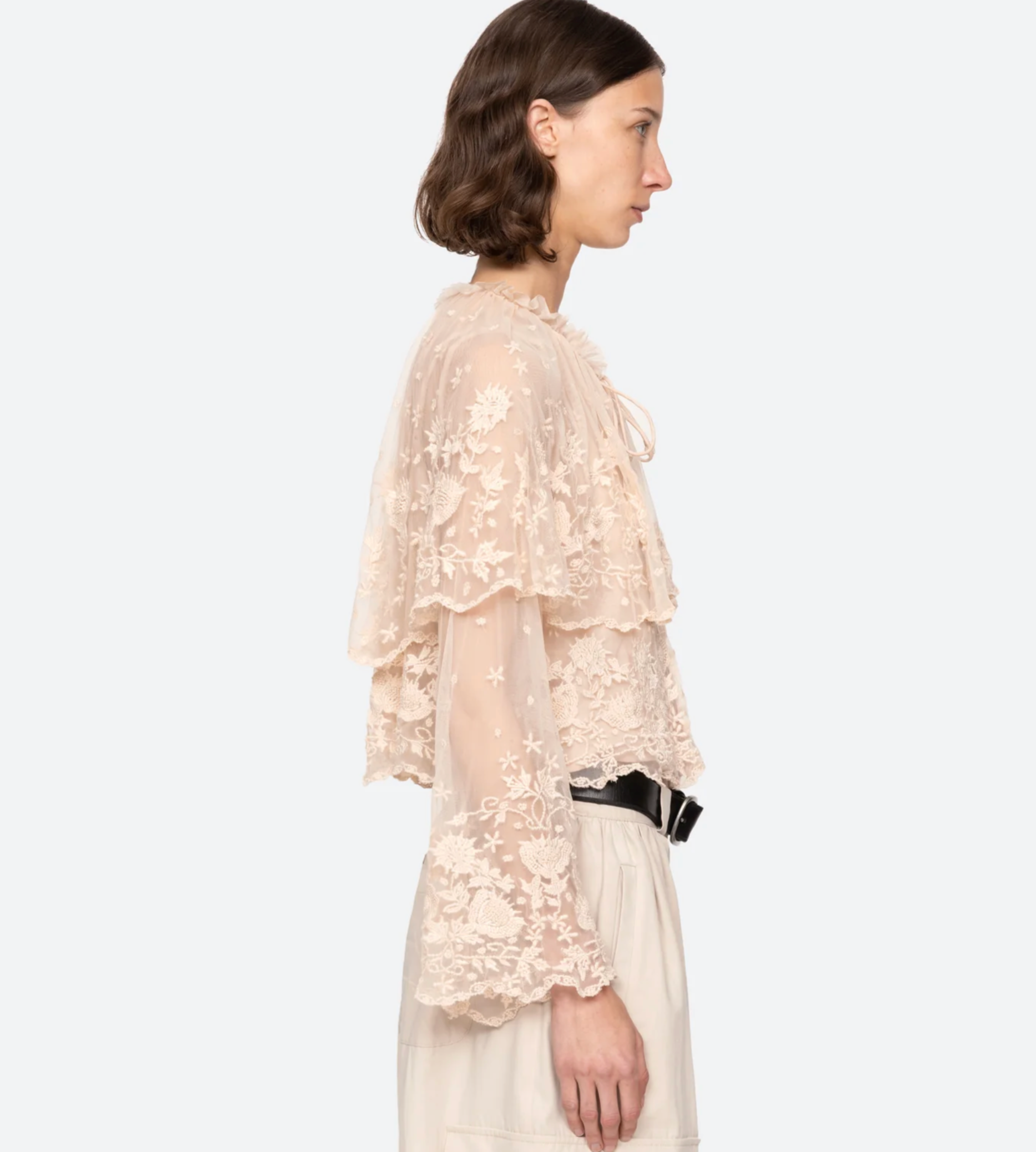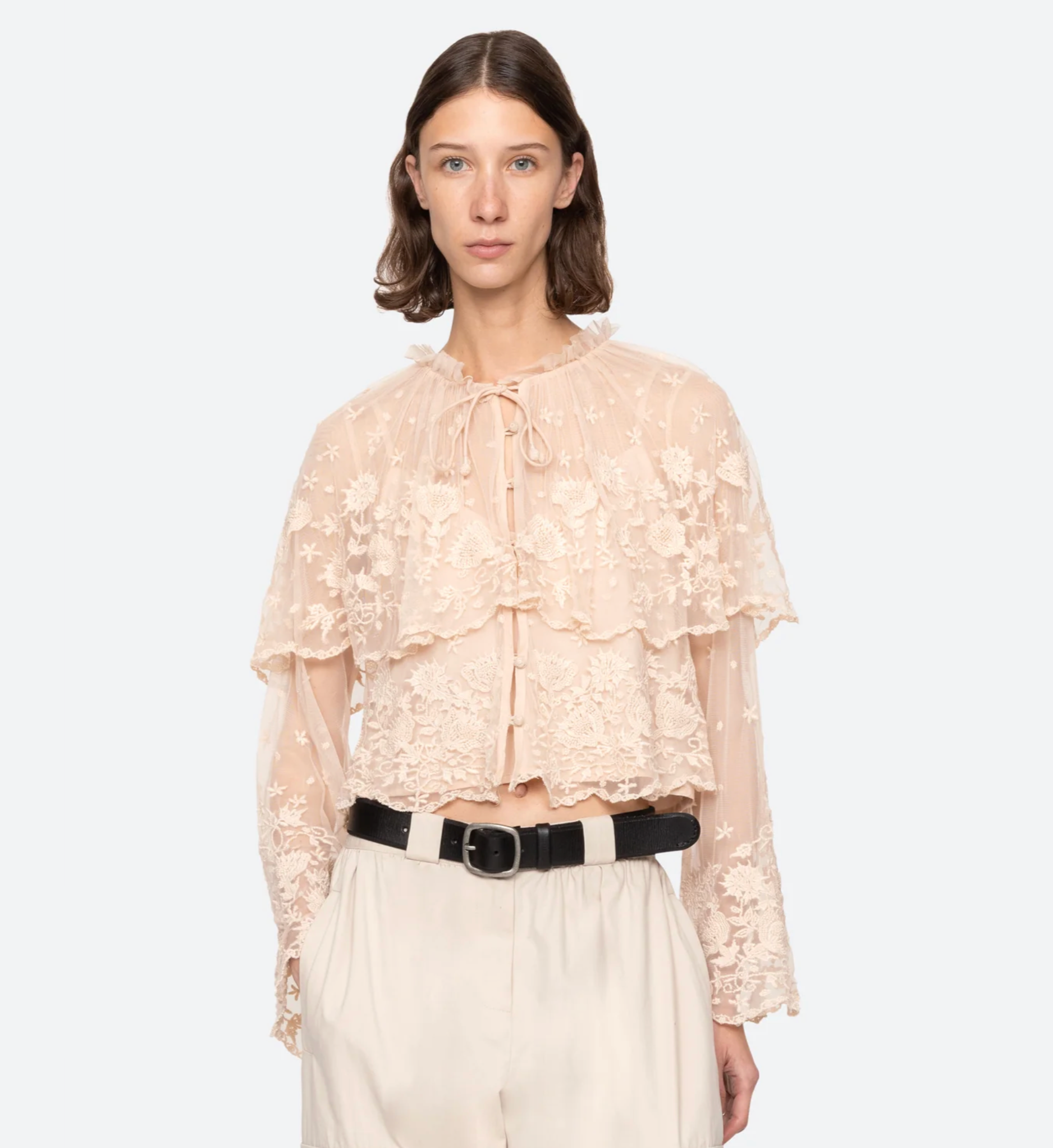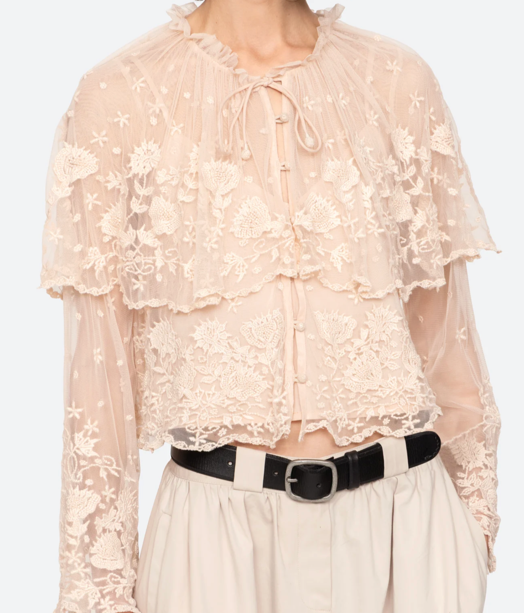 The Bronte embroidered top is crafted from sheer, embroidered mesh and features a romantic capelet overlay, long flowing sleeves, and a front tie closure.