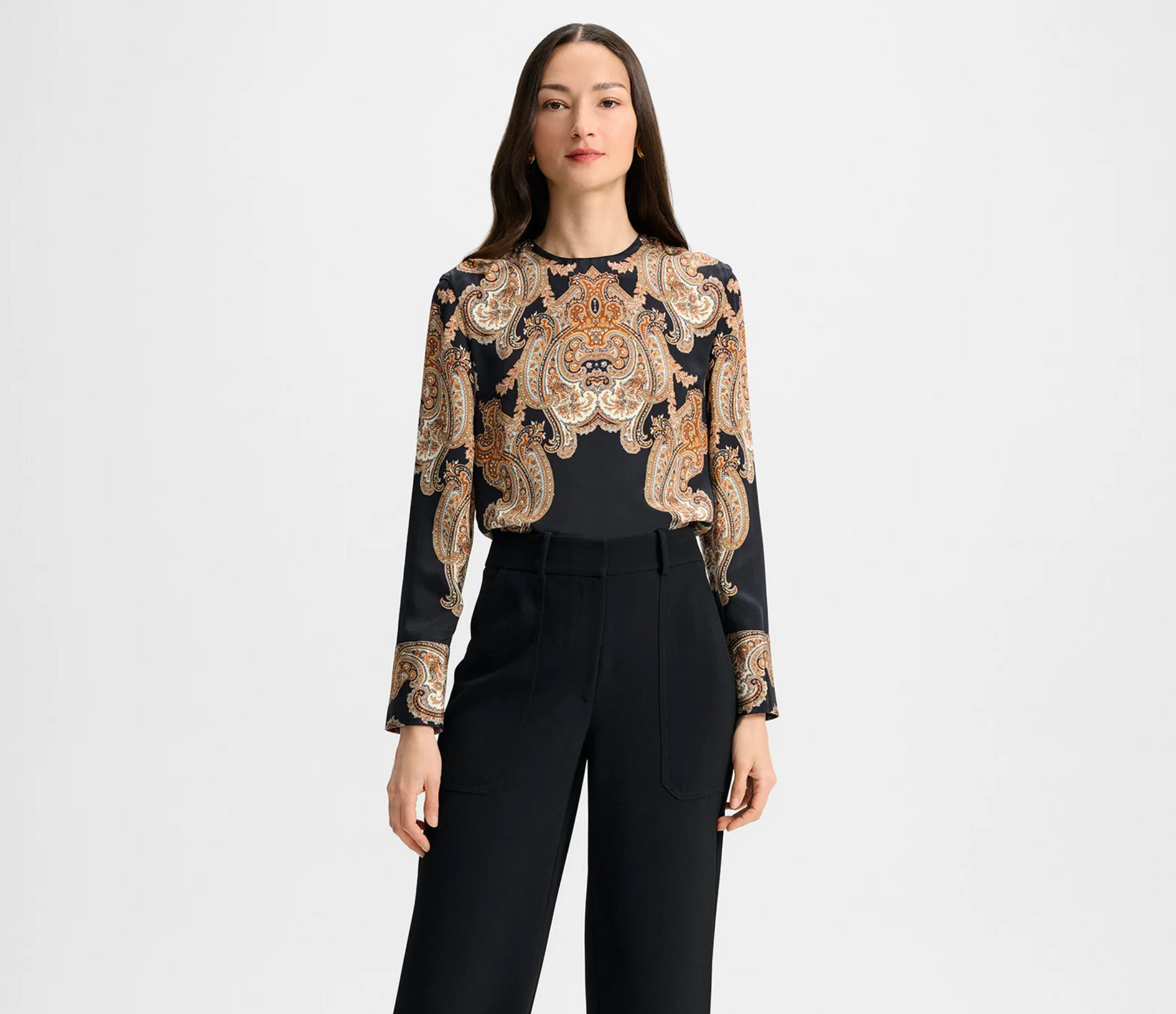 Crafted from a luxe silk blend, Karisse is a long-sleeve, crew neck top with a relaxed, straight fit, defined by a graphic beige paisley motif and wide sleeve cuffs.