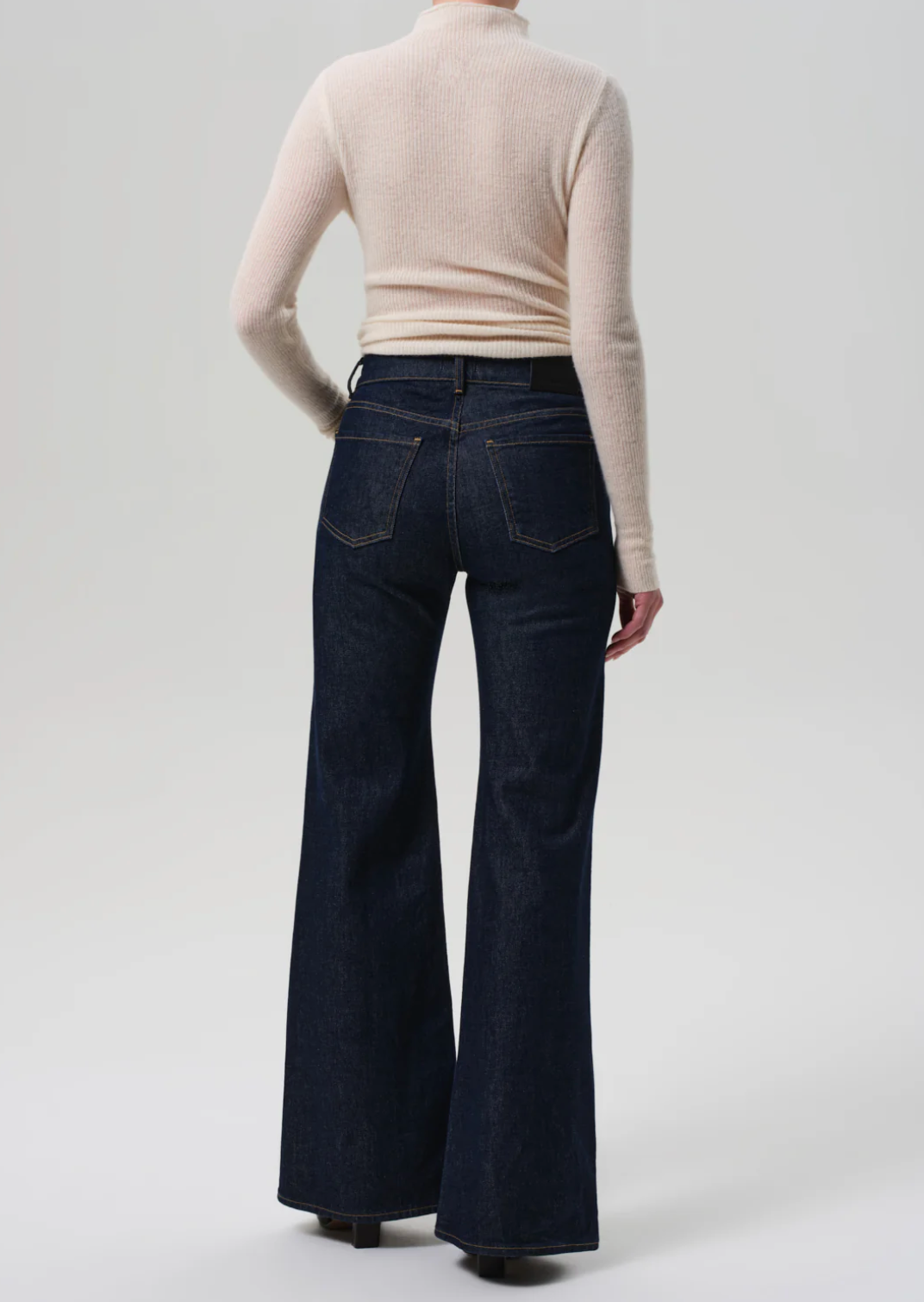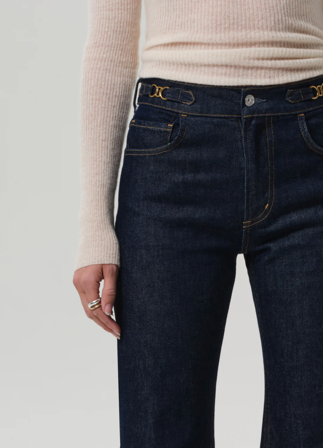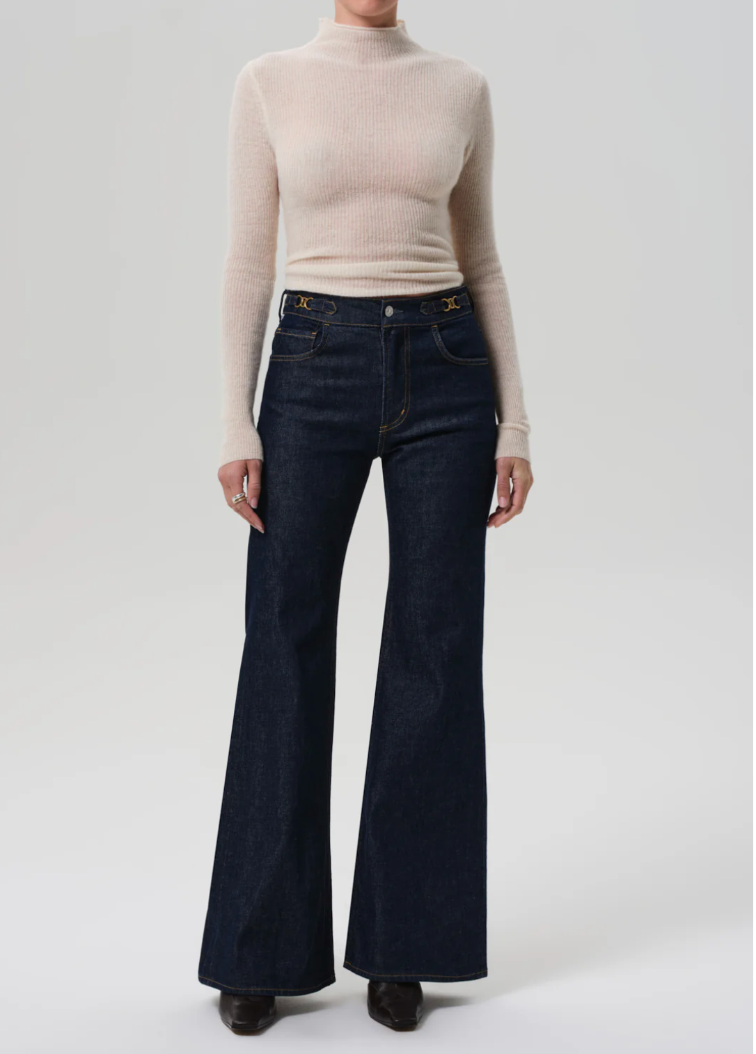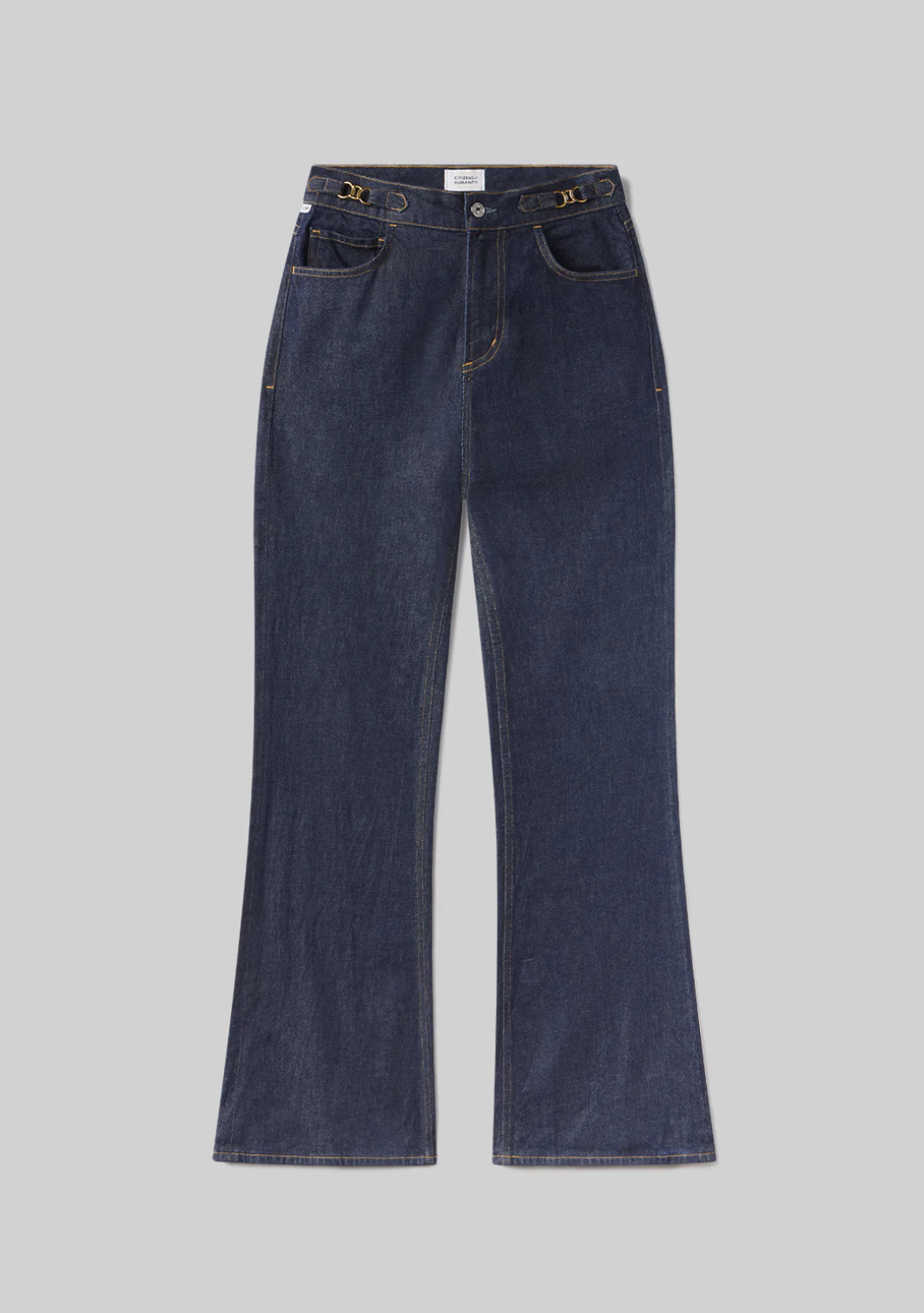 The Kimberly is a high-rise flare inspired by classic '70s silhouettes, designed to elongate the leg and contour the waist. This version is finished with horsebit detailing at the waistband for a refined, equestrian-inspired touch. Crafted from comfort stretch denim with a super soft hand, the Helia wash—a clean, dark indigo rinse—adds a polished finish. Style with crisp shirting or a fitted knit for elevated ease.