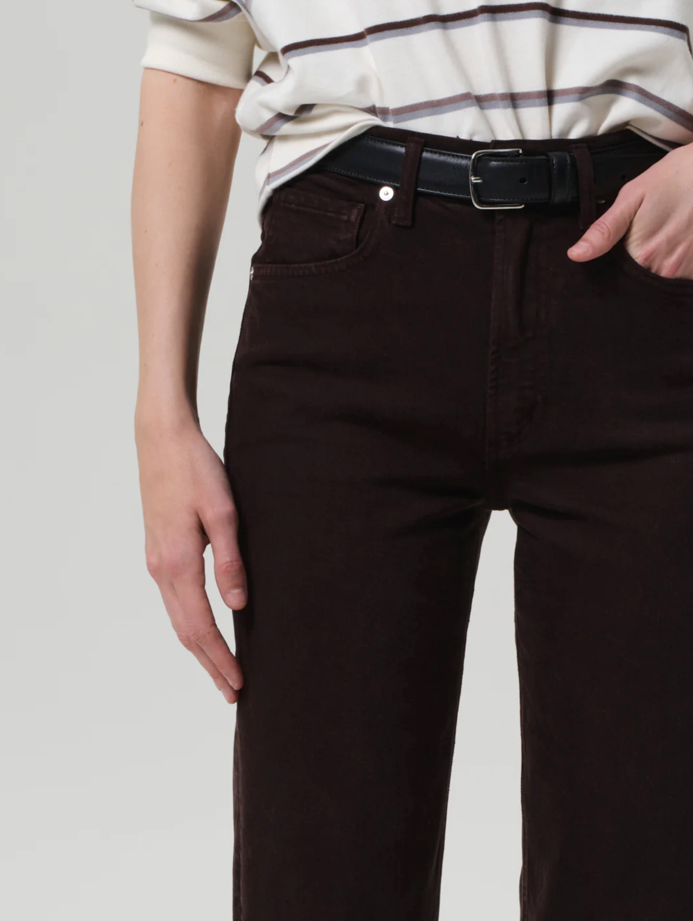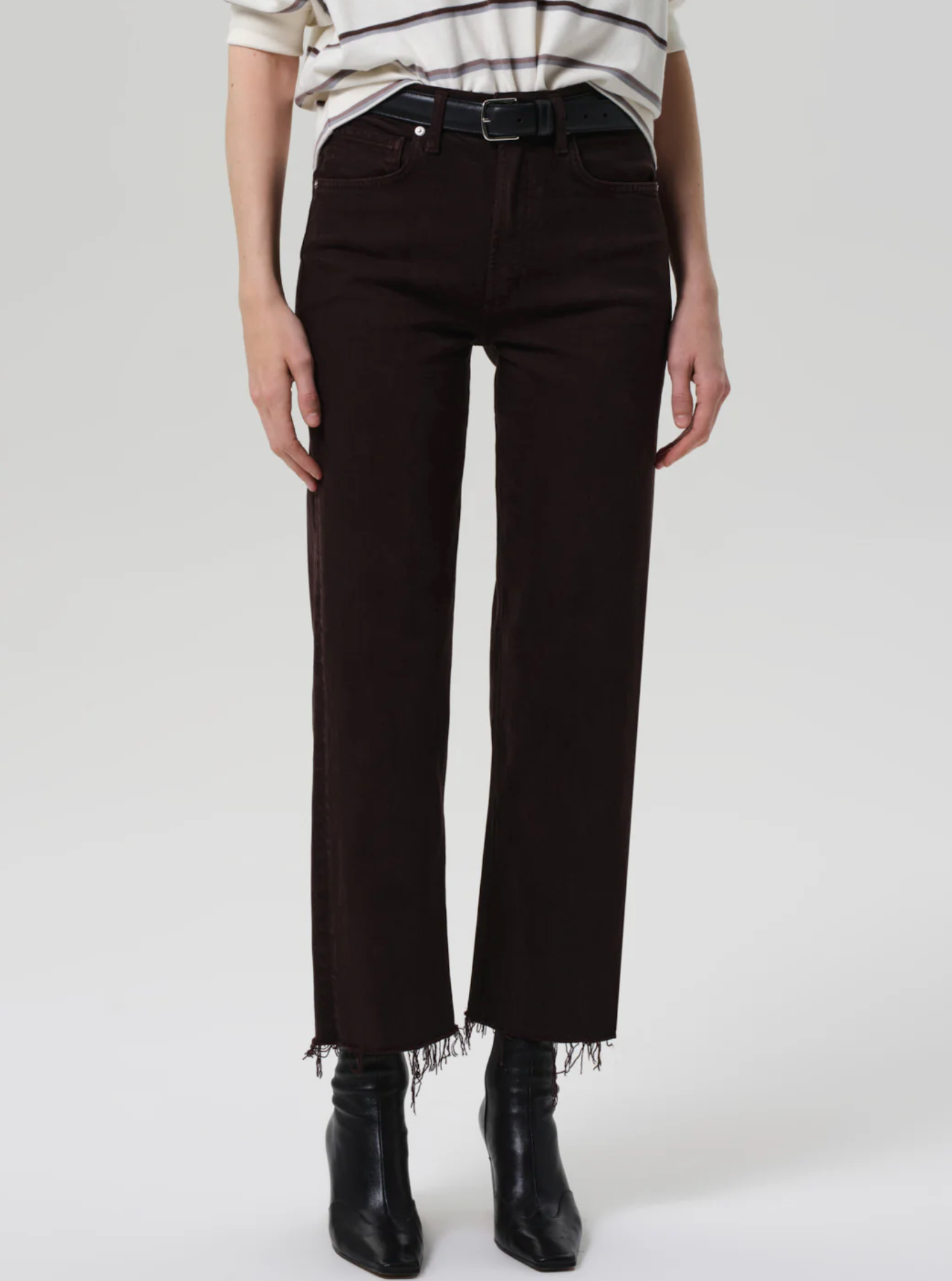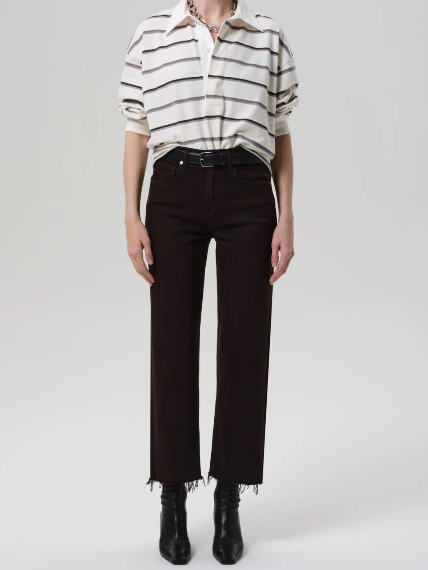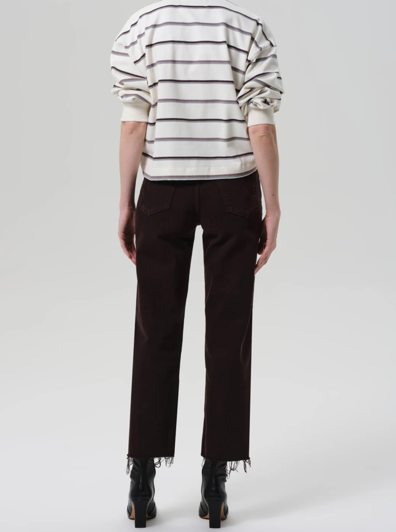The ‘Palma’ denim is a modern straight leg with a streamlined, ankle-length cut. Crafted from a chocolate brown soft stretch denim with a lightweight feel.