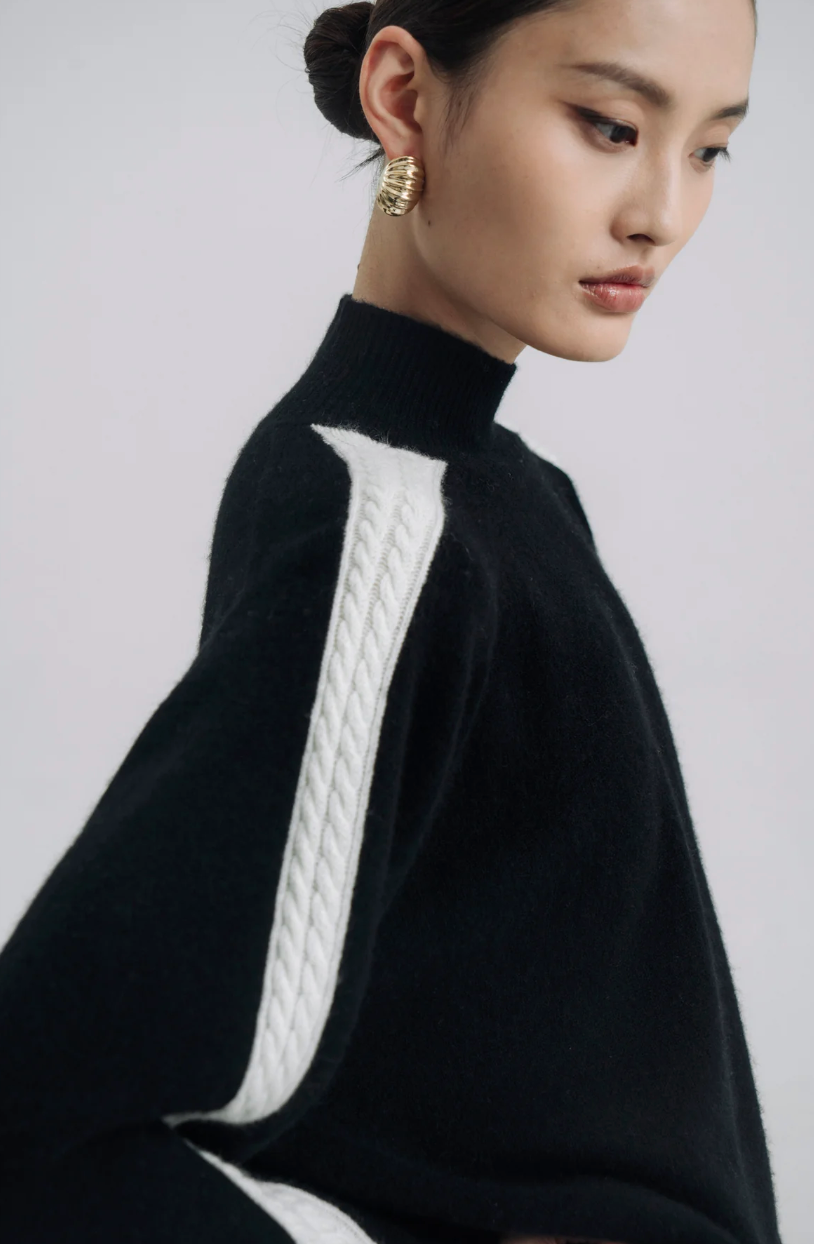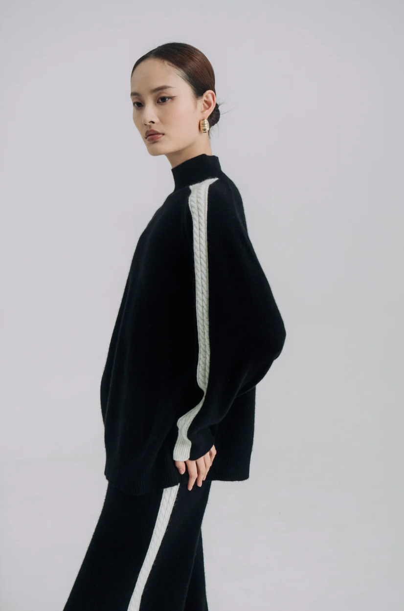 Cashmere blend sweater with cable knit racer stripe. Match with coordinating pants.